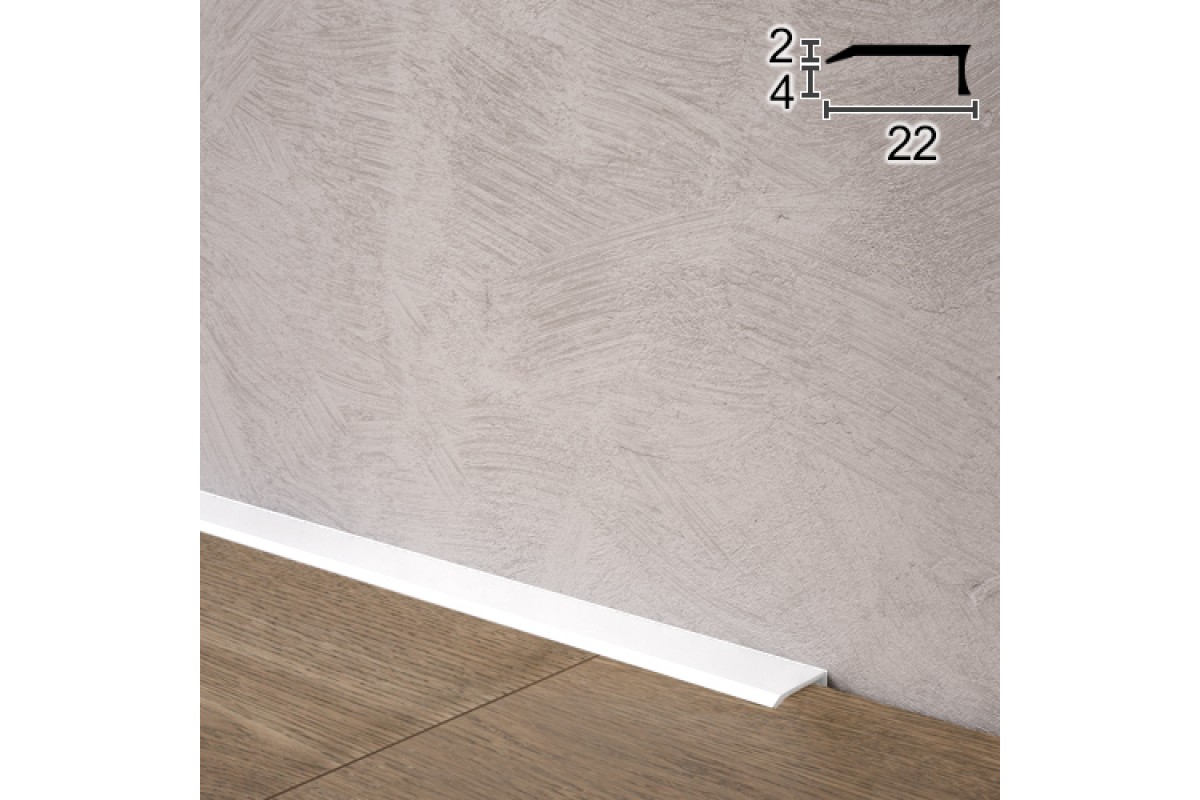 Минимальные габариты плинтуса не привлекают к себе излишнего внимания, эстетически скрывая стык пола и стен, высота профиля 2мм с перекрытием по полу 22мм.