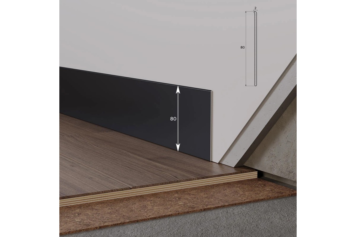Плинтус алюминиевый WT NL80, тончайший плинтус 2мм в виде полосы алюминия, порошковая выкраска RAL9005 чорный.