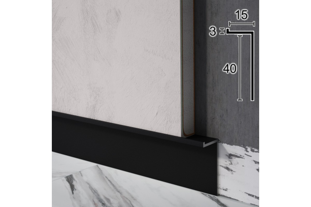 Плинтус WT P104 алюминиевый скрытый 40мм выкрашенный RAL9005 чорный. Глибина плинтуса 15 мм специально под лист гипсокартона и толщину последующей шпаклевки.