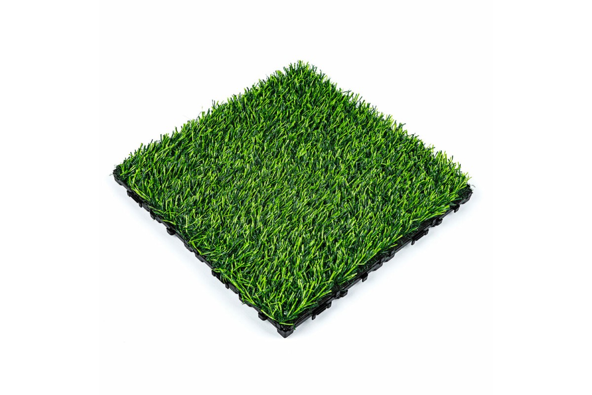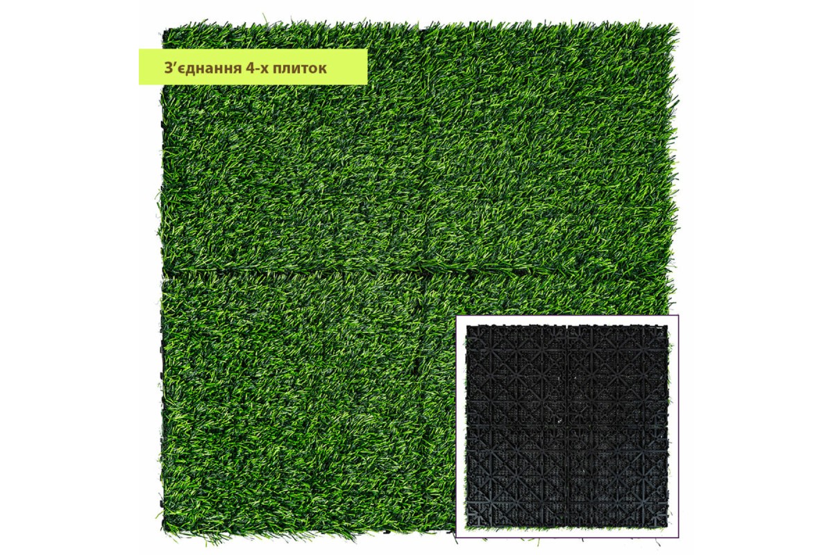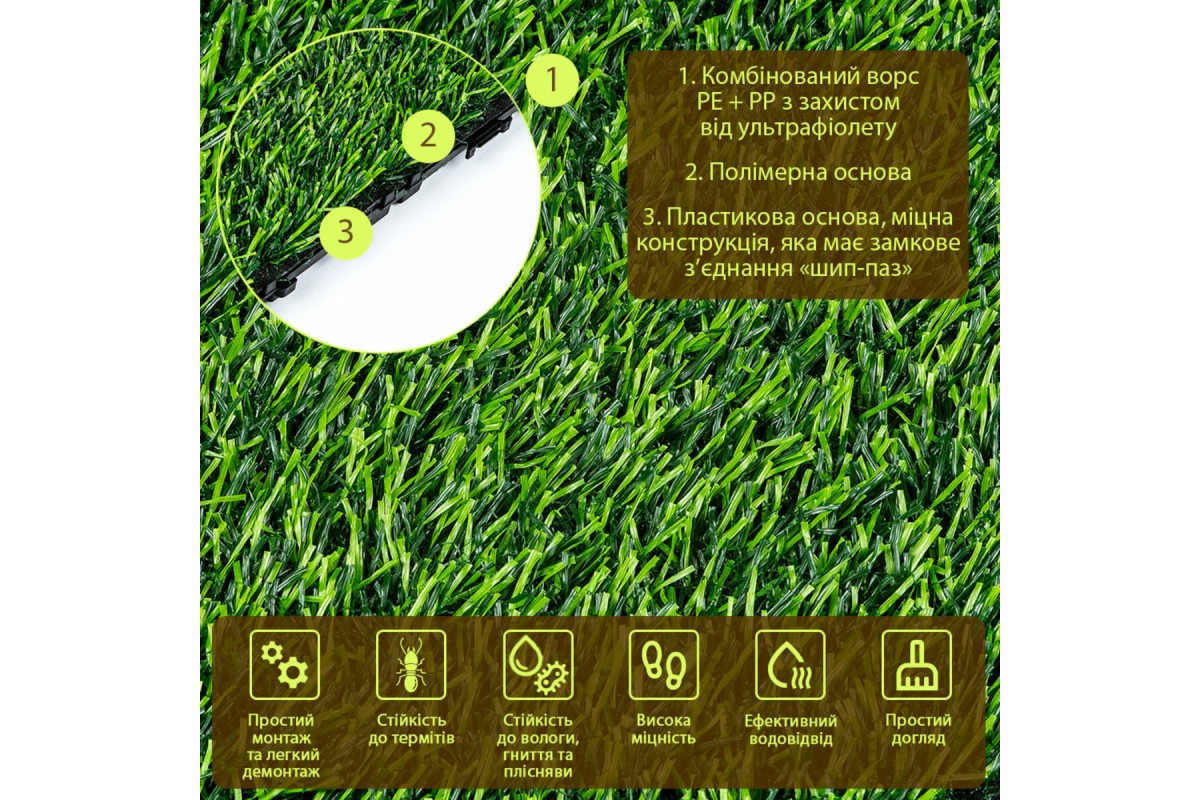 Верхній шар виготовлений із комбінованого ворсу PE+PP з УФ-захистом, що забезпечує природний вигляд, м’якість і стійкість кольору до вигорання. Текстура рельєфна, схожа на природну фактуру трави.