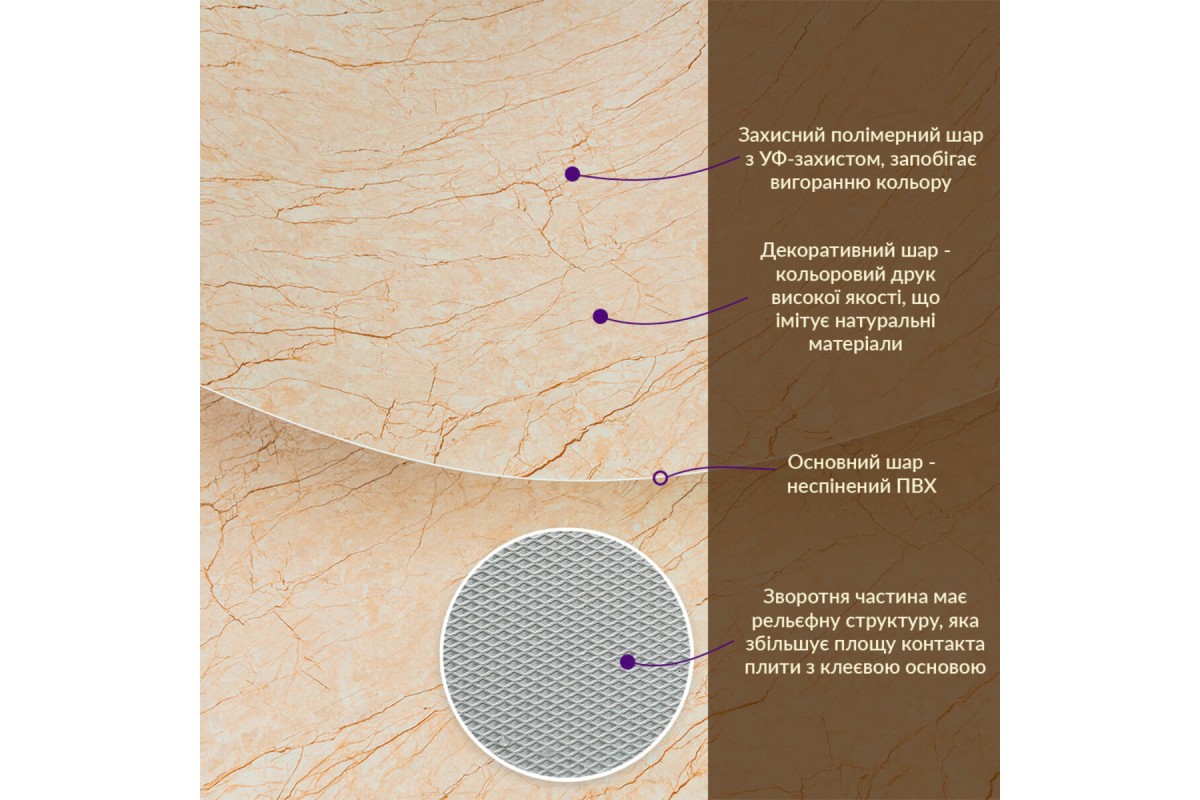 Панелі мають повну імітацію обробки каменю, аналогічно керамічній плитці мають глянсову поверхню.