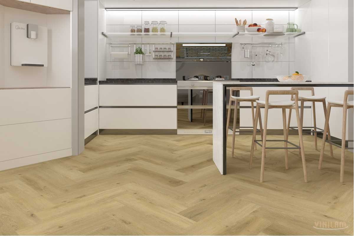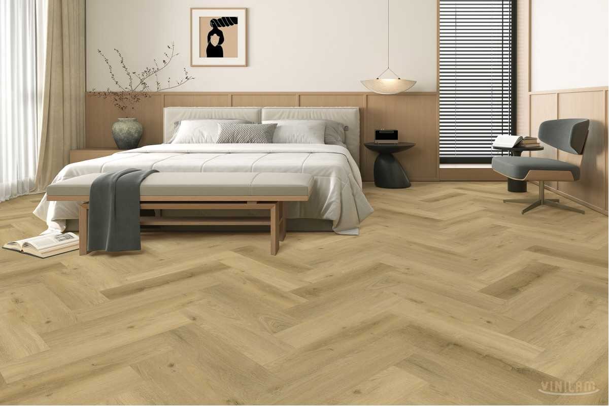 Виниловая плитка Vinilam 291156 Дуб Грин Классический коллекция 2.5мм Herringbone, укладка английской елкой.
