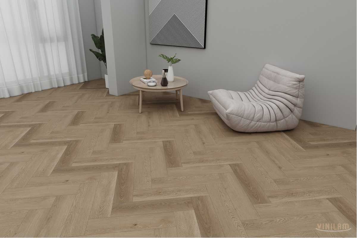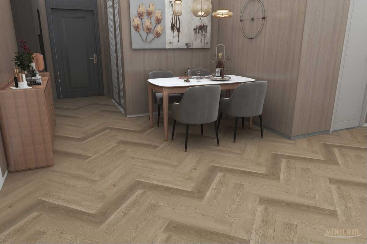 Виниловая плитка Vinilam 65325 Дуб Грин Грей коллекция 2.5мм Herringbone, укладка английской елкой.