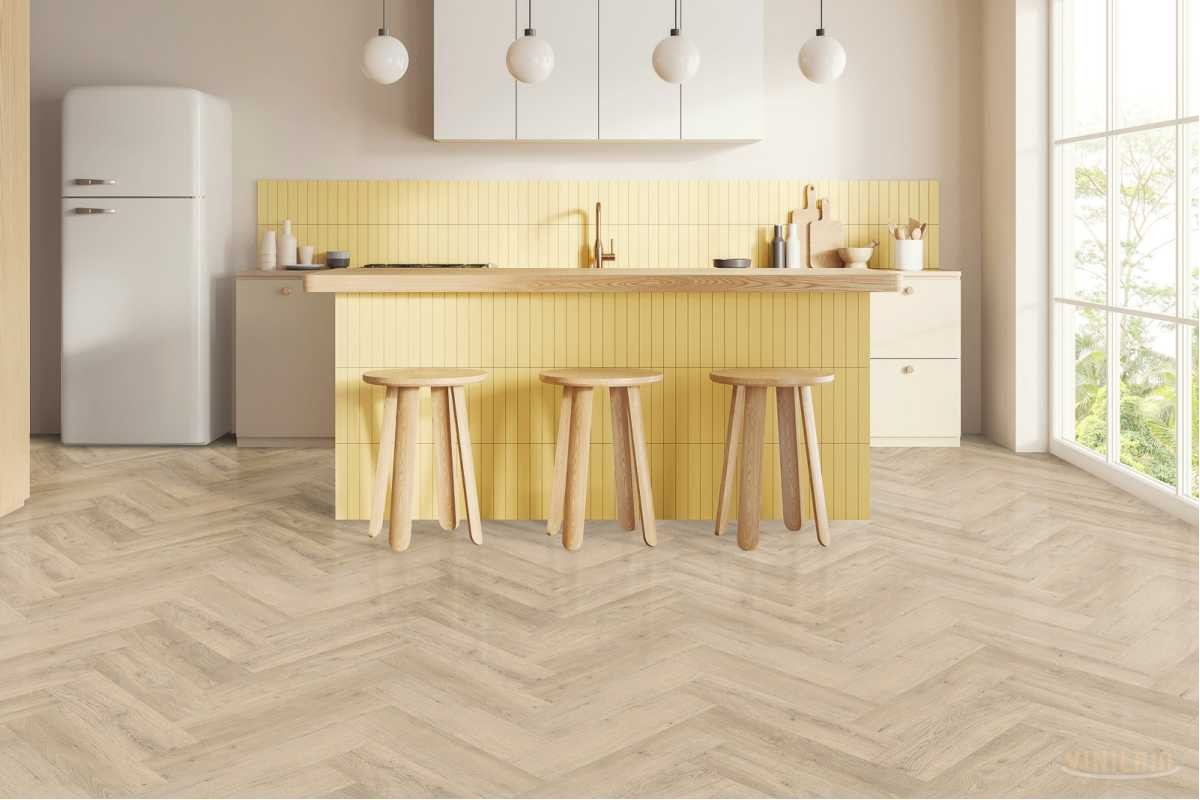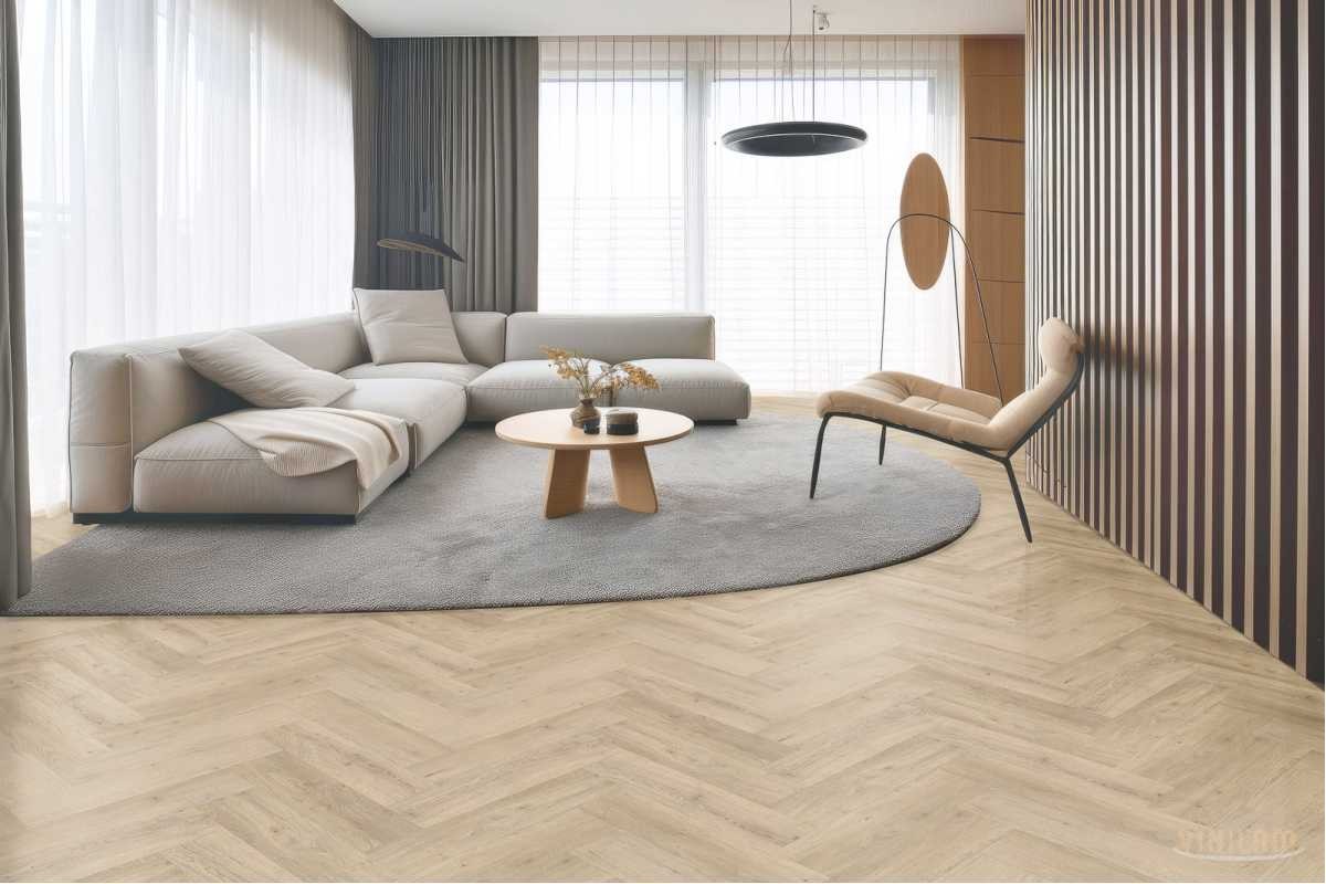 Виниловая плитка Vinilam MS1018 Дуб Сканди коллекция 2.5мм Herringbone, укладка английской елкой.