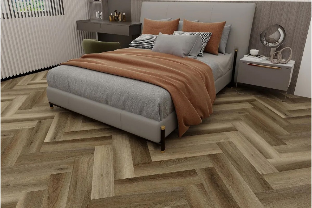 Виниловый ламинат BLISSGROUND Aruba Breeze серия Herringbone Line SPC - иммитация кладки английскрой елочой.