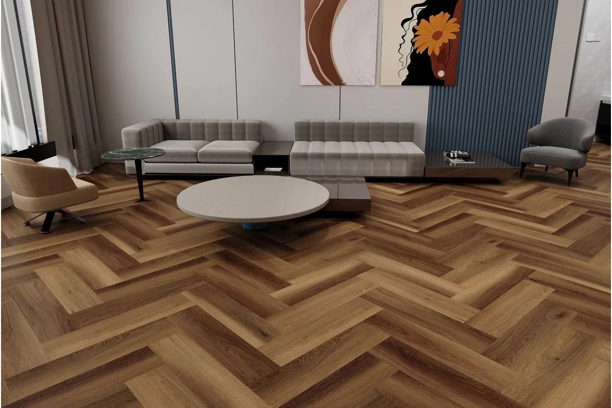 Виниловый ламинат BLISSGROUND Aruba Drift серия Herringbone Line SPC - иммитация кладки английскрой елочой.