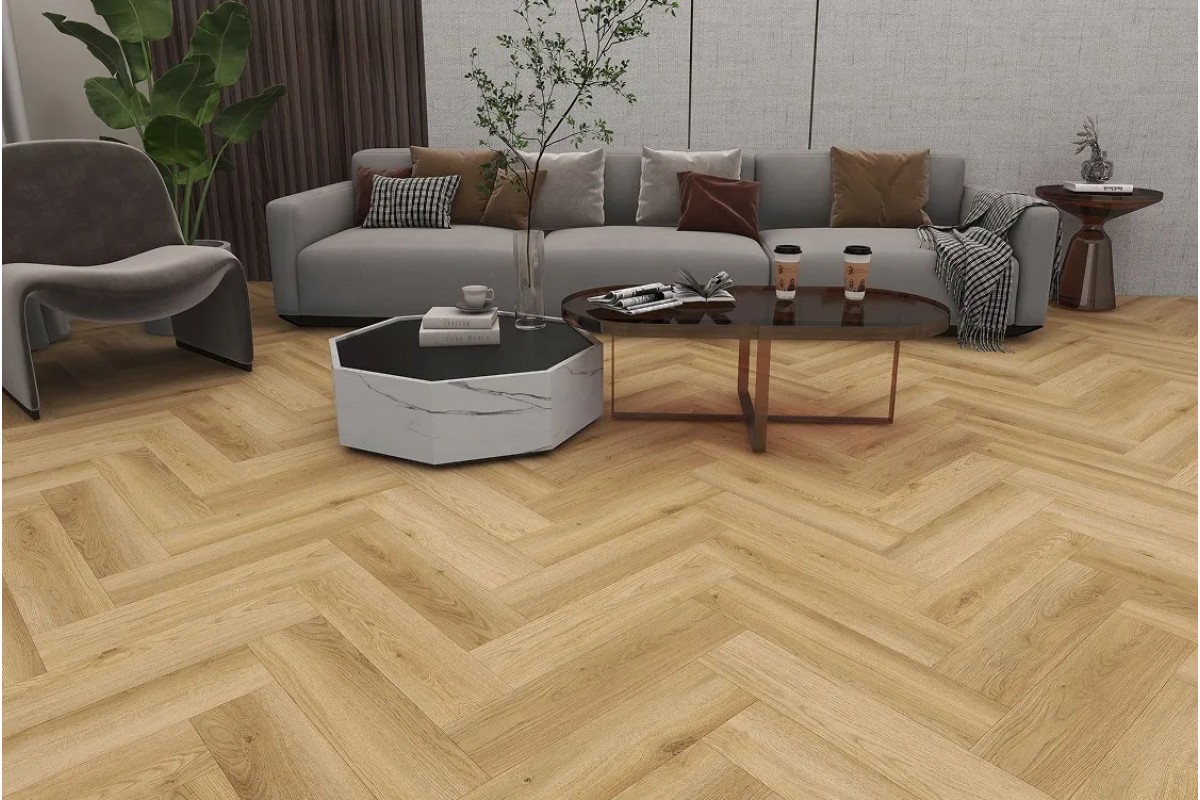 Виниловый ламинат BLISSGROUND Lisbon View серия Herringbone Line SPC - иммитация кладки английскрой елочой.