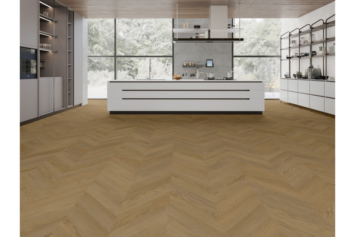 Виниловый ламинат Mercury Chevron ME11 Aurora серия American collection SPC от SLCC имеет 4-х стороннюю фаску и формат укладки ввиде французской "ёлочки".
