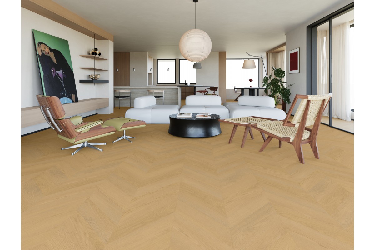 Виниловый ламинат Mercury Chevron ME16 Solara серия American collection SPC от SLCC имеет 4-х стороннюю фаску и формат укладки ввиде французской "ёлочки".