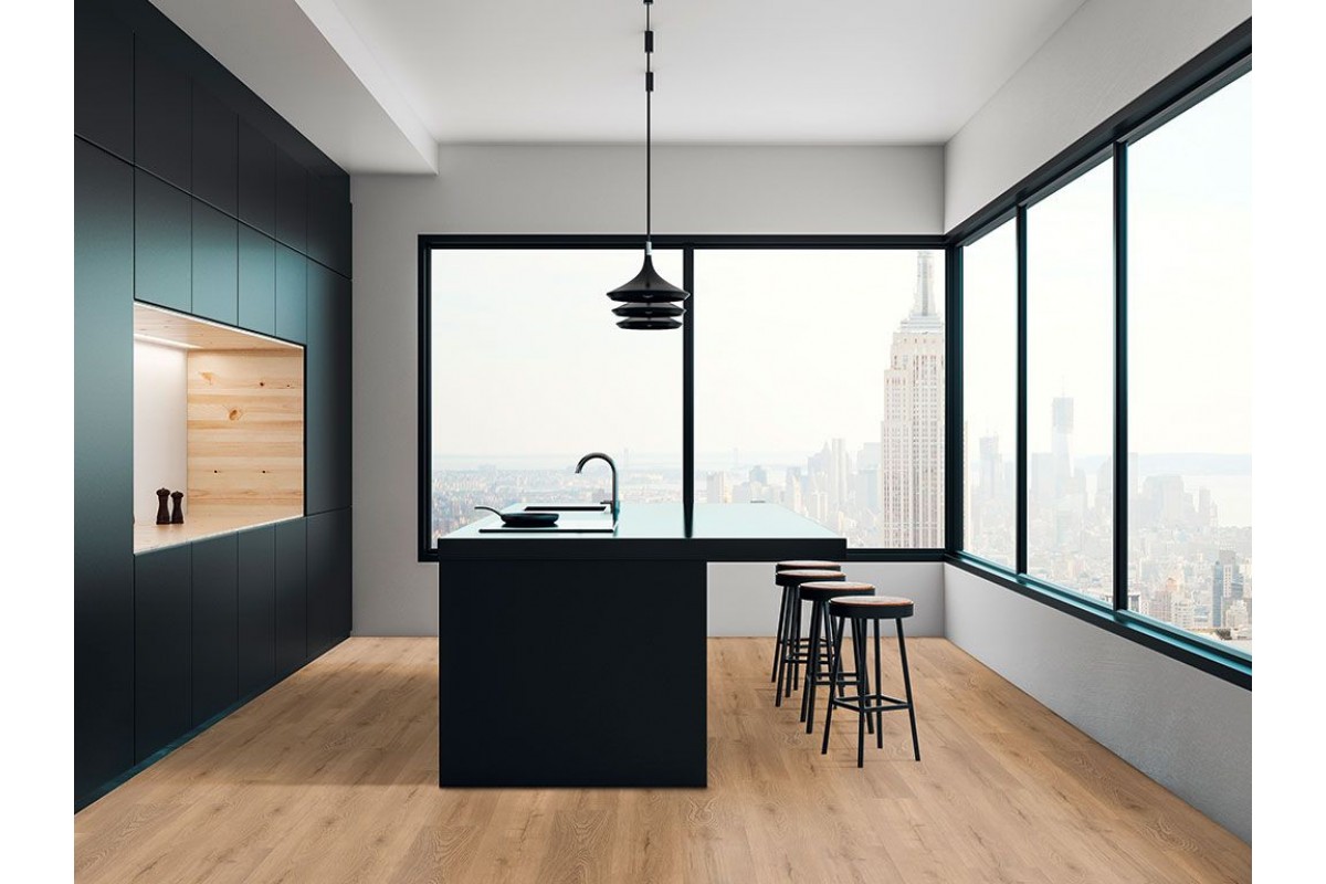 Коллекция Basic имеет широкую планку 1220x230 мм при толщине 5,0 мм с классом использования 34 и интегрированной шумопоглощающей подложкой.